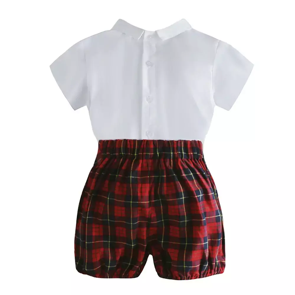 Esta peça de vestuário de alta costura combina o clássico e o moderno: uma camisa social branca de manga curta com gola peter pan e um charmoso short xadrez tartã nas cores vermelho e marinho.