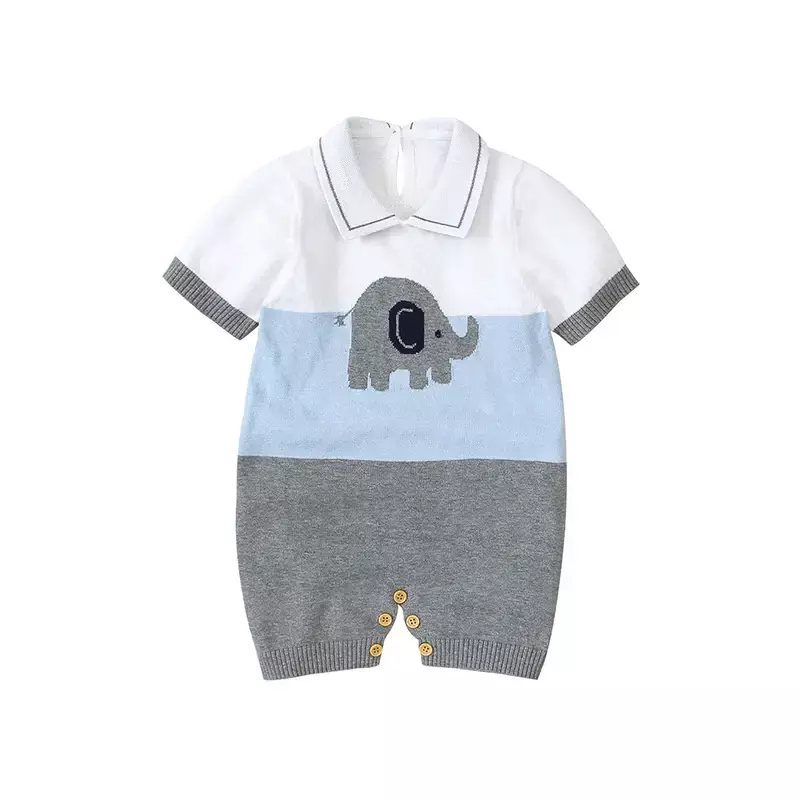 Macacão Bebê Curto Tricot Elefante da Bebê Colmeia, a peça perfeita para unir conforto, estilo e diversão nos dias quentes! Este rmacacão exclusivo é feito em tricot macio e possui um design em blocos de cores (branco, azul claro e cinza), destacando um adorável elefante bordado no peito.