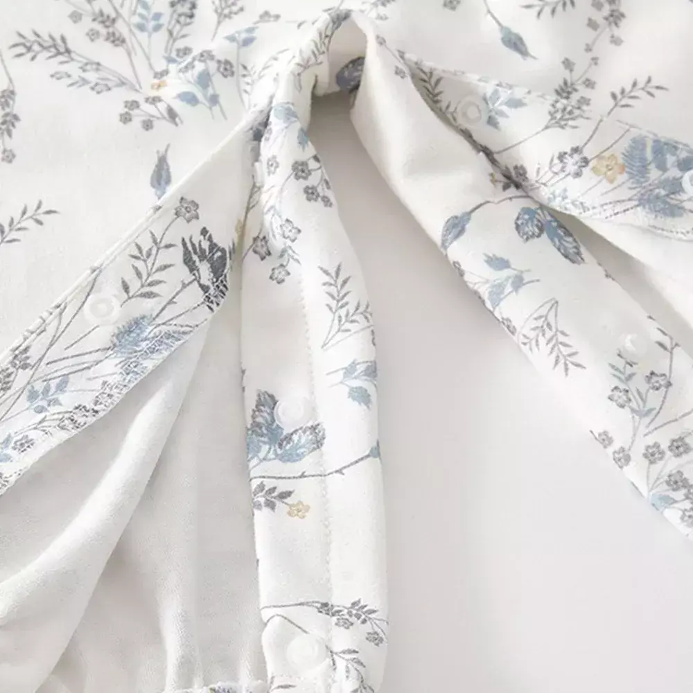 Este macacão longo é confeccionado em malha macia com uma estampa sutil de folhagens e flores em tons suaves (azul e cinza), perfeito para os primeiros meses de vida.