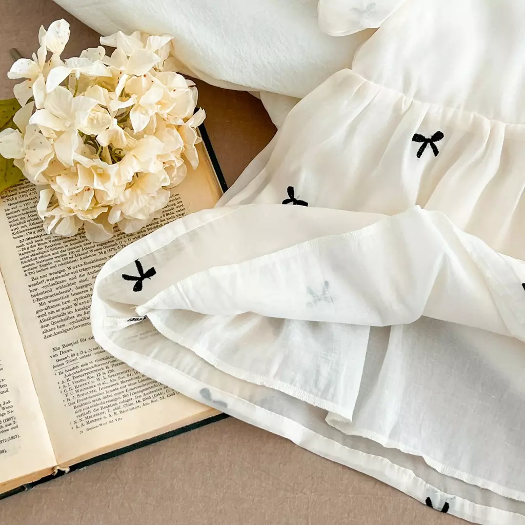 Confeccionado em um tecido leve e semitransparente na cor off-white, este vestido é adornado com delicados laços pretos bordados por toda a peça.