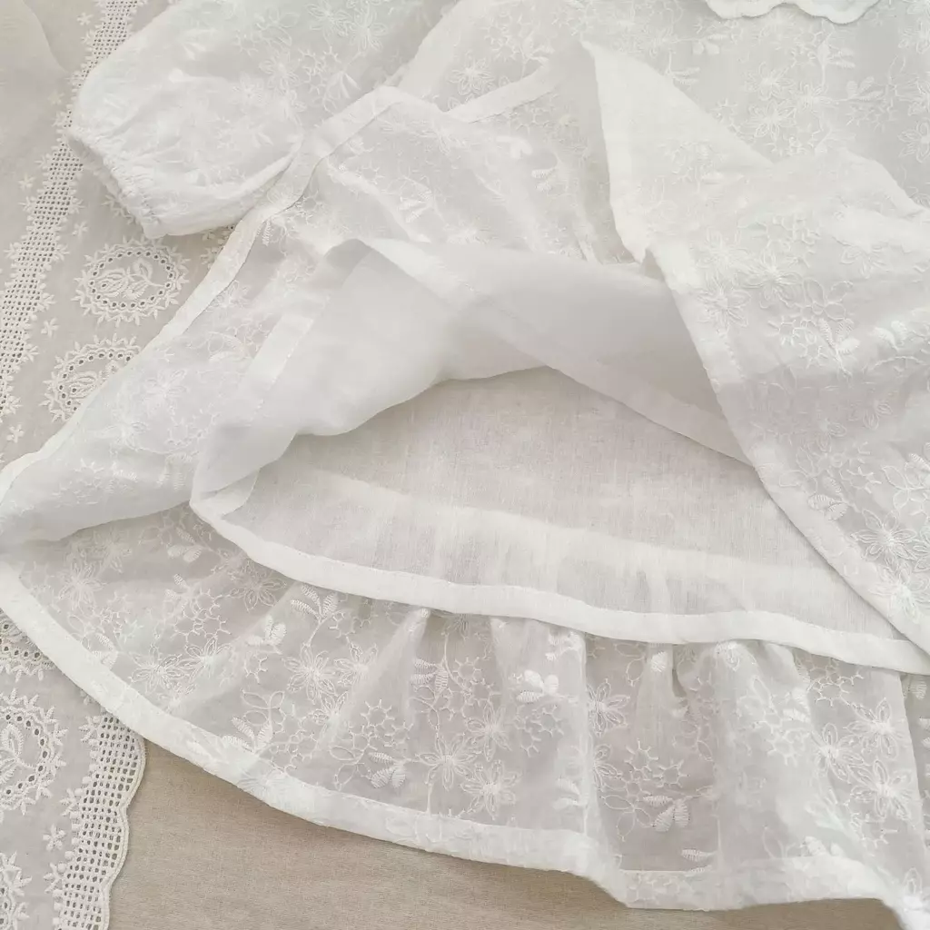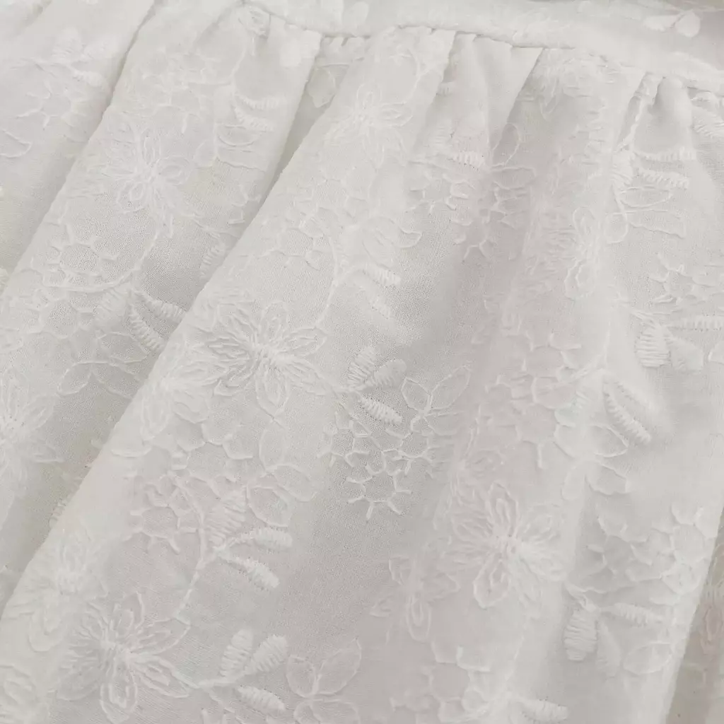 Confeccionado em um tecido branco texturizado, este vestido de manga longa bufante e gola babado é perfeito para diversas ocasiões, desde um passeio casual até um evento semi-formal.